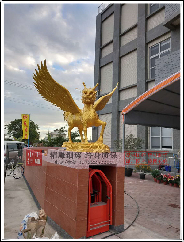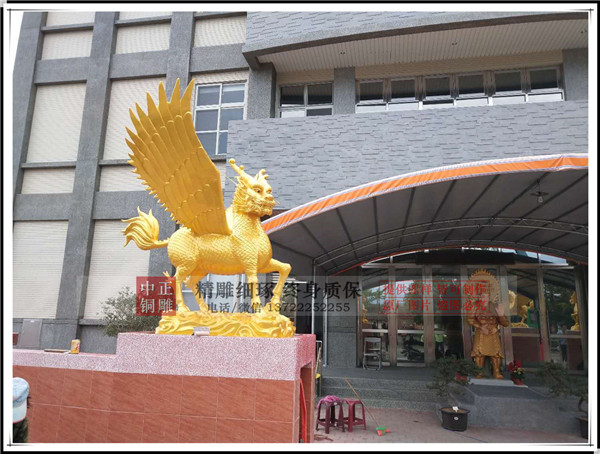 河北唐縣中正銅雕廠生產(chǎn)制作的鑄銅飛天麒麟,麒麟有臺(tái)灣客戶設(shè)計(jì)效果圖,我廠制作泥稿,開(kāi)模,鑄銅。麒麟總高1.75米,底座高0.24米。鑄銅厚度8毫米。表面采用鈦金漆噴漆工藝,表面做氟碳漆保護(hù)。安裝于臺(tái)灣苗栗縣中天法門會(huì)場(chǎng)大門口。